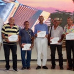 El presidente de BBVA, Óscar Cabrera, el presidente de Colpensiones, Juan Miguel Villa y los cinco artistas vallenatos: José Enrique Alvarado Carranza, mejor conocido como Chelo Alvarado; Alfonso Agustín Calderón Márquez; Antolín Antonio Arias López; Julio César García Peralta y Edilberto Altamar Gámez al momento de recibir las certificaciones que los acreditan con beneficiarios de los BEPS.