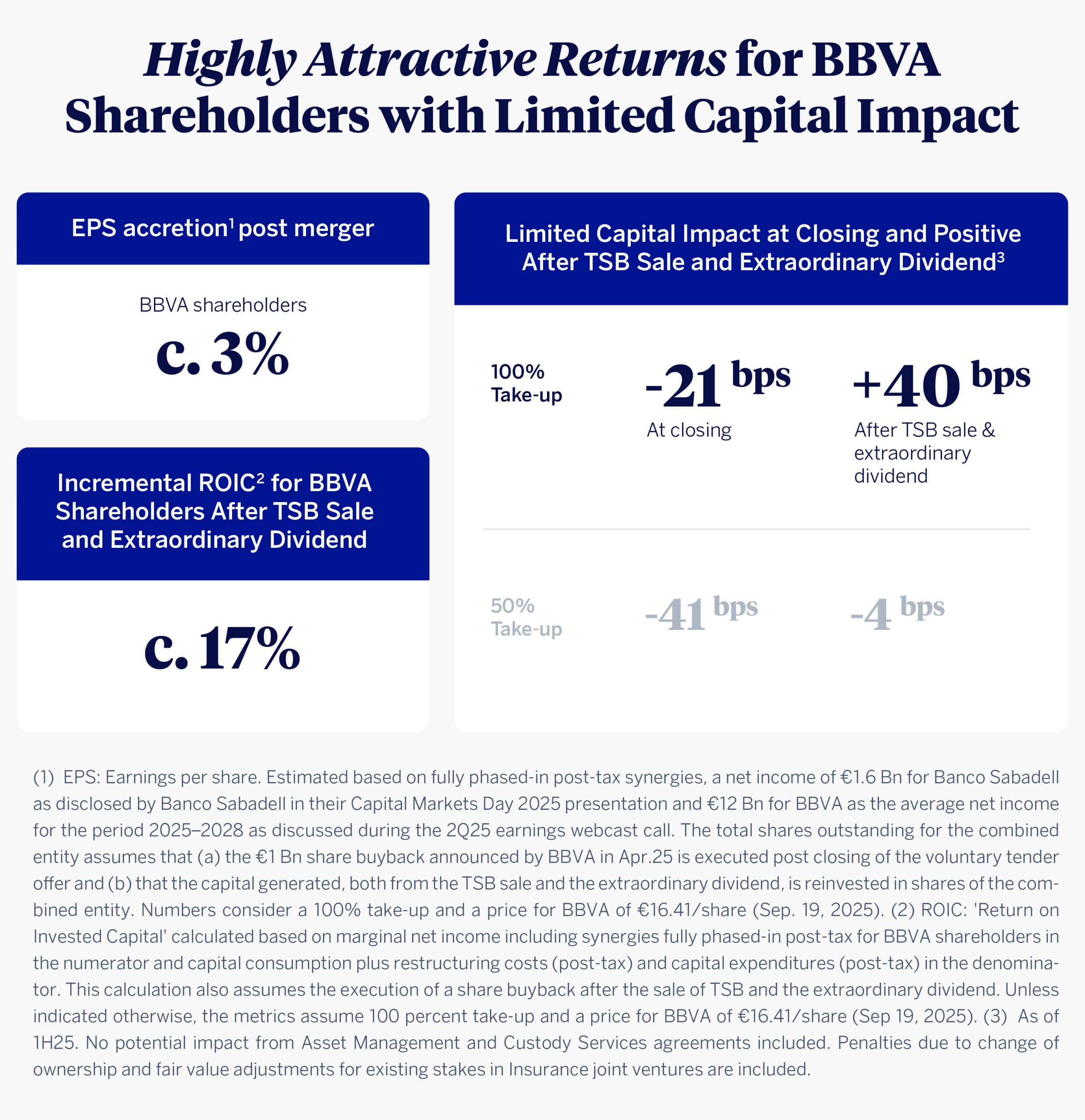 For BBVA shareholders, this transaction is also accretive in terms of earnings per share from the first year following the merger, with an improvement of c. 3 percent and a high return on investment (incremental ROIC of around 17 percent).