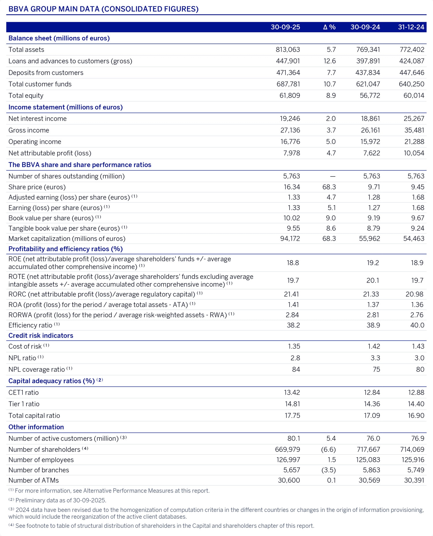 Relevant data of the BBVA Group (consolidated figures) at 30-09-2025. This section contains all the updated quarterly figures on the balance sheet and income statement, and other relevant data.