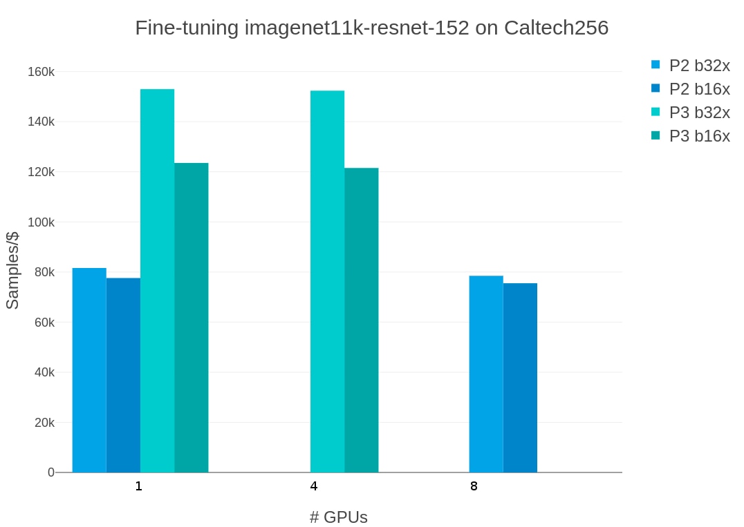 We repeated our fine-tuning experiments in these new P3 instances, to compare with the previous results on P2. For this purpose we used the NVIDIA Volta Deep Learning AMI, with the optimized MxNet container from NVIDIA GPU Cloud (nvcr.io mxnet:17.10) running on CUDA-9.