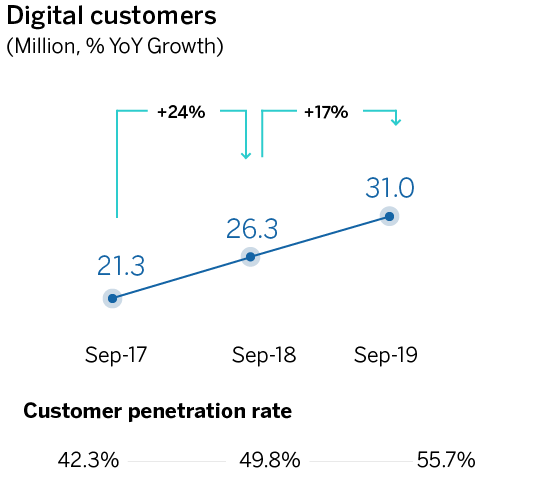 The number of digital customers increased 17 percent over the past 12 months to 31 million, accounting for 55.7 percent of the customer base. Within this group, mobile customers grew 26 percent to 27.6 million, or 49.7 percent of the total customer base, inching closer to the 50 percent target set for the year. Finally, digital sales accounted for 58.9 percent of total unit sales and 44.8 percent in terms of economic value (PRV), in line with the target to surpass the 50-percent threshold in 2020.