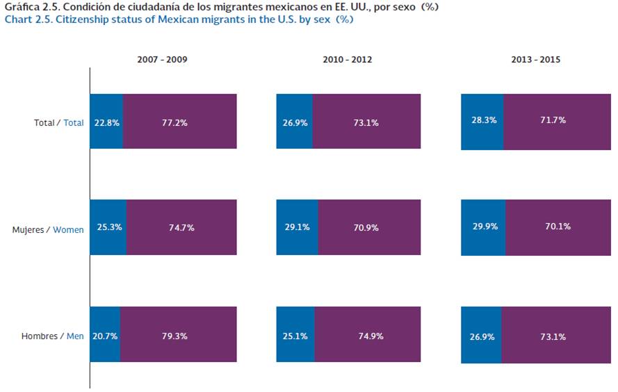 Entre los años 2013-2015 se observó un crecimiento en el porcentaje de migrantes mexicanos que cuentan con ciudadanía estadounidense, al llegar a 28.3%. La menor llegada de nuevos migrantes mexicanos a EE.UU., tanto documentados como no documentados, y la permanencia y/o alargamiento de la estancia de los que ya se encontraban en el vecino país del norte, son factores que explican este crecimiento gradual.