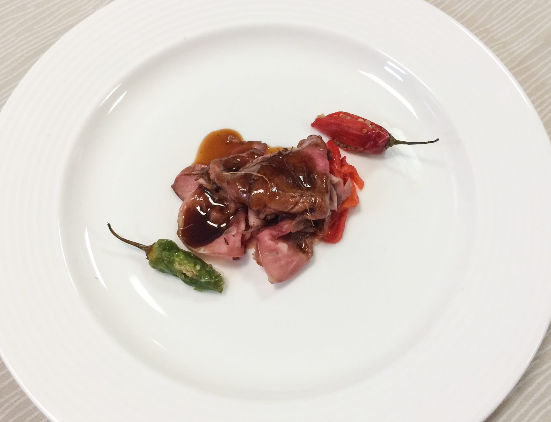 Los platos fuertes incluían una ensalada con helado de hoja de plátano, gel de lulo, tomate, aguacate, encurtidos con vinagre de banano; un gazpacho de calabaza y granadilla con tartar de vieira a la brasa y arepa de queso; coco verde con langostino y hogao colombiano; mero con achiote, remolacha, ají de maní, hogao, aceite de cilantro y lima, patata violeta y puré de boniato; costilla de cordero con café y berenjena, espuma de queso, remolacha asada y reducción de granadilla; y un jarrete de ternera cocinado a baja temperatura con chili relleno de quinoa al curry verde.