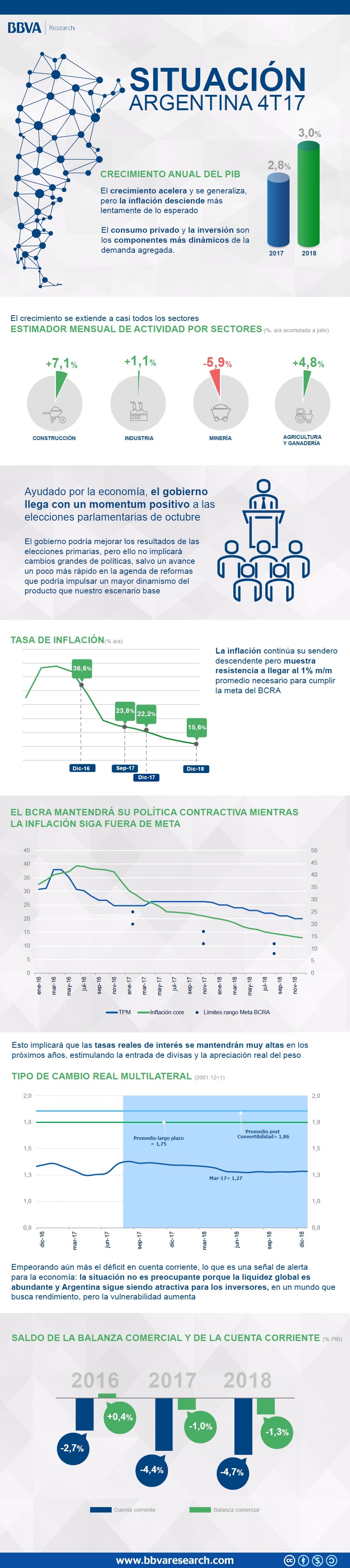 En el segundo trimestre de 2017, el Producto Interno Bruto (PIB) de Argentina creció 0,7% respecto al trimestre anterior, manteniendo una tendencia positiva por cuarto trimestre consecutivo. El crecimiento llegaría a 4% en el cuarto trimestre, comparado interanual, en línea con la previsión de 2,8% de incremento del PIB para el total de 2017, estimado por BBVA Research en su informe Situación Argentina, 4° Trimestre de 2017.