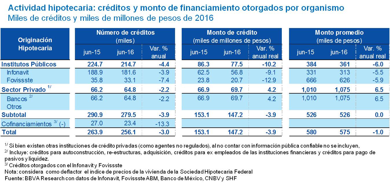Las cifras de los institutos públicos muestran un descenso en la originación de hipotecas respecto al 2015. No obstante, el Infonavit está cercano del cumplimiento de su meta que para este 2016 es de 350 mil créditos para adquisición. La comparación contra 2015 cuando se disparó el crédito como consecuencia de los incrementos de los límites de crédito por parte de ambos institutos, puede dar la apariencia de una caída. BBVA Bancomer espera que se cumpla la colocación de estos 350 mil créditos, aún con el menor flujo de subsidios para la vivienda.