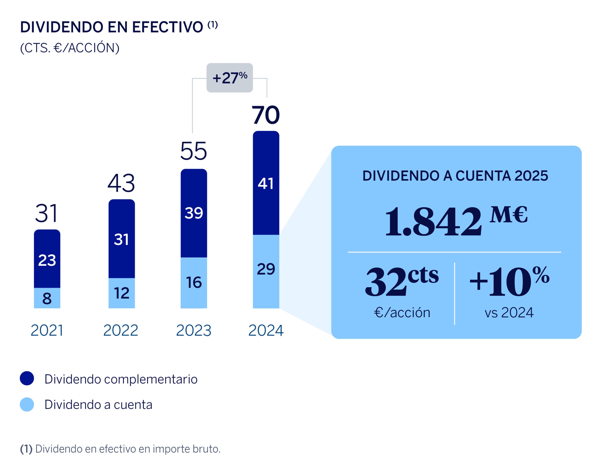 Los accionistas de BBVA recibirán este viernes 7 de noviembre un dividendo a cuenta de los resultados de 2025 de 32 céntimos de euro brutos por acción, en efectivo, un 10% más que en 2024. Este es el dividendo a cuenta más alto de la historia de BBVA. En total, el banco entregará 1.842 millones de euros en efectivo a sus accionistas.