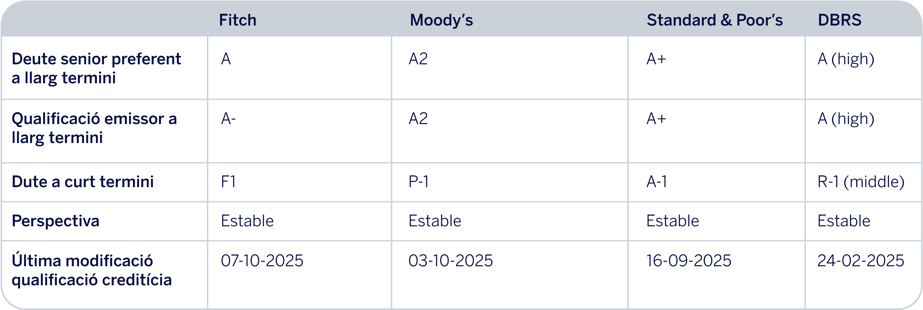 Fitch estima que la ràtio de capital CET1 se situarà gradualment a la part superior de l’objectiu de l’11,5%–12 %, gràcies a noves distribucions de capital, la seva capacitat de creixement orgànic i la possible adquisició de Banc Sabadell. Finalment, posa en valor el seu perfil de finançament, amb “sòlides franquícies locals” i “un ampli accés a una gran base d’inversors a través de fonts de finançament majorista diverses”.
