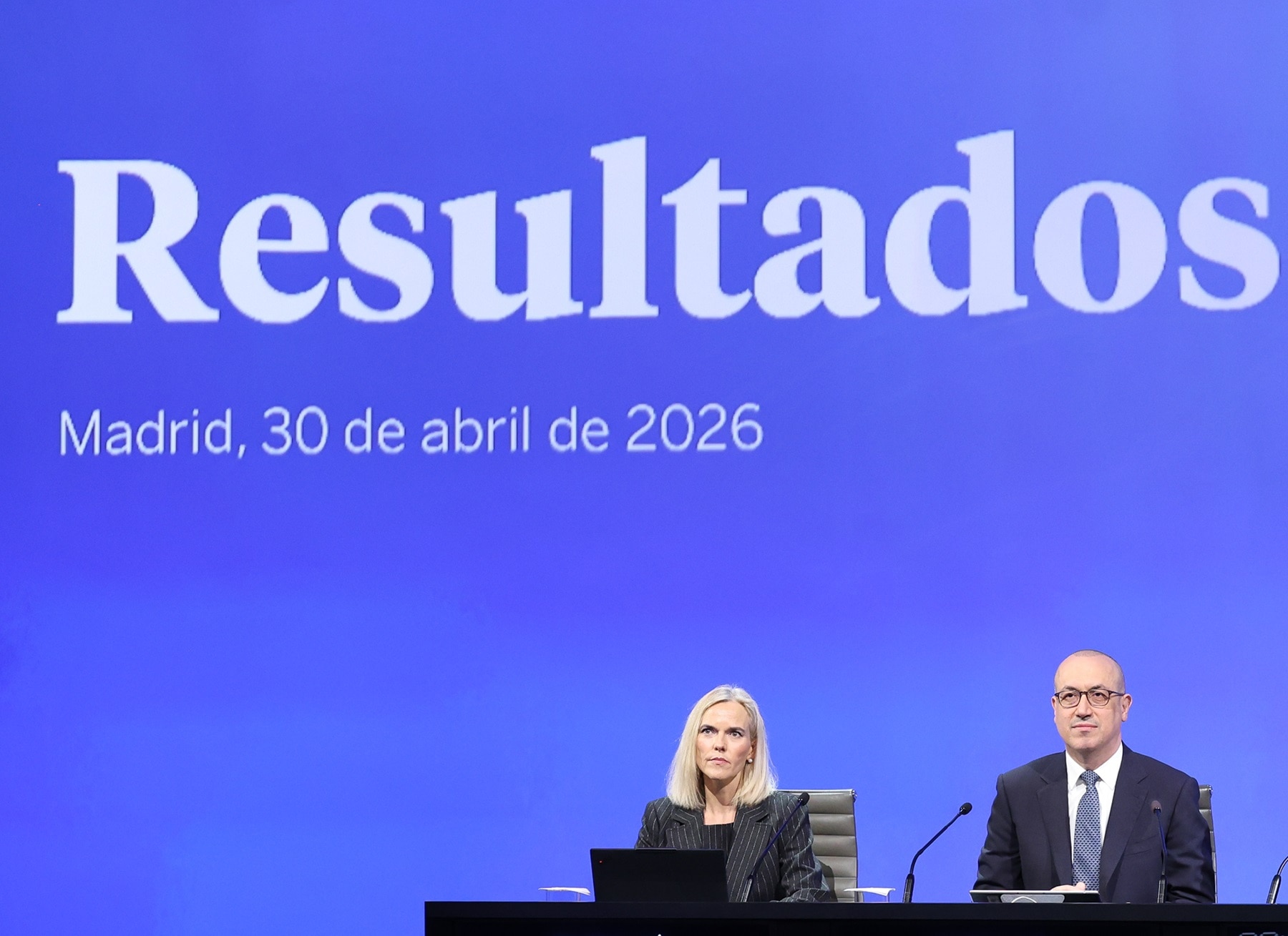 - Luisa Gómez Bravo, directora financiera de BBVA, y Onur Genç, consejero delegado de BBVA, durante la rueda de prensa