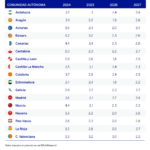 En 2027, la creación de empleo mantendría un ritmo algo más moderado, con Galicia (2,4%), La Rioja (2,3%), Andalucía (2,2%), Navarra (2,2%), Castilla-La Mancha (2,1%), Cataluña (2,1%), Cantabria (2,1%), Extremadura (2,1%) y Madrid (2,0%) entre las regiones con mayor crecimiento. En contraste, Baleares (1,6%), Castilla y León (1,6%), Murcia (1,6%), Canarias (1,5%) y Asturias (1,3%) mostrarían incrementos más contenidos, en línea con un menor impulso del turismo y de la demanda interna.