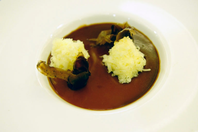 Ostra al Albariño, puré de manzan, destilado de tierra, ajofermentado y limón