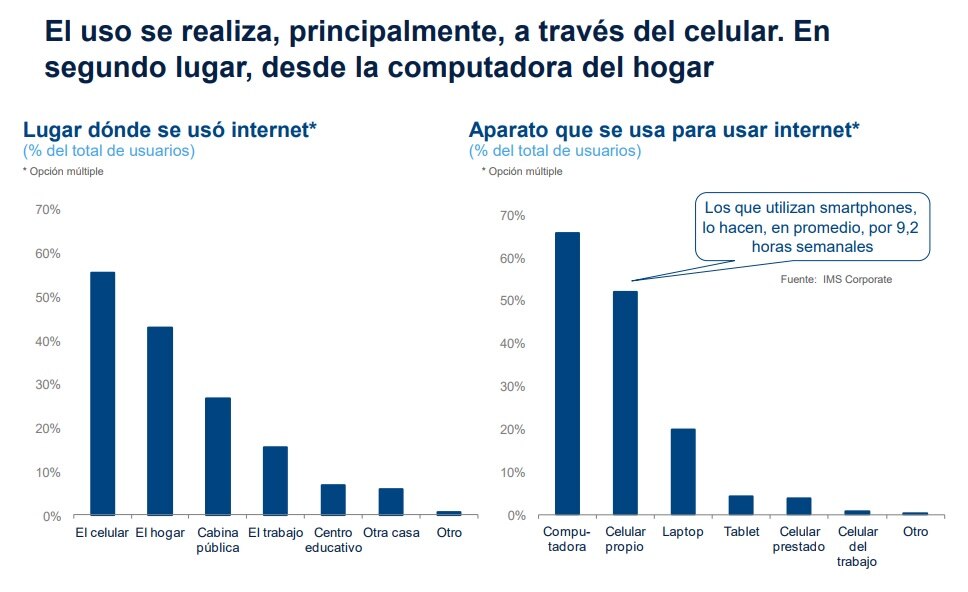En el informe, BBVA Research destaca que el uso de internet por parte de las personas se realiza, principalmente, a través del teléfono celular, que ya superó a las computadoras del hogar. Los principales usos del internet en Perú son: comunicarse, obtener información y entretenerse. La banca electrónica y la compra de productos/servicios son menos usados, pero han cobrado relevancia.