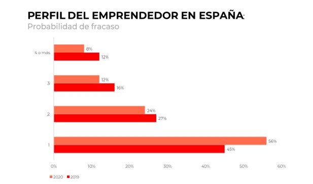 Además, los datos de este año refuerzan la idea de que la experiencia previa es un factor que contribuye al éxito de sus nuevos proyectos: la probabilidad de fracaso entre los emprendedores que solo han puesto en marcha un proyecto anteriormente es del 56%, mientras que esta cifra baja hasta el 8% en el caso de quienes han puesto en marcha cuatro o más proyectos empresariales.