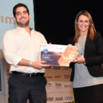 Andrés Levín , de DIMO junto con Adriana Ocampo, de BBVA Uruguay, recogiendo su cheque a la final regional de Open Talent. - BBVA