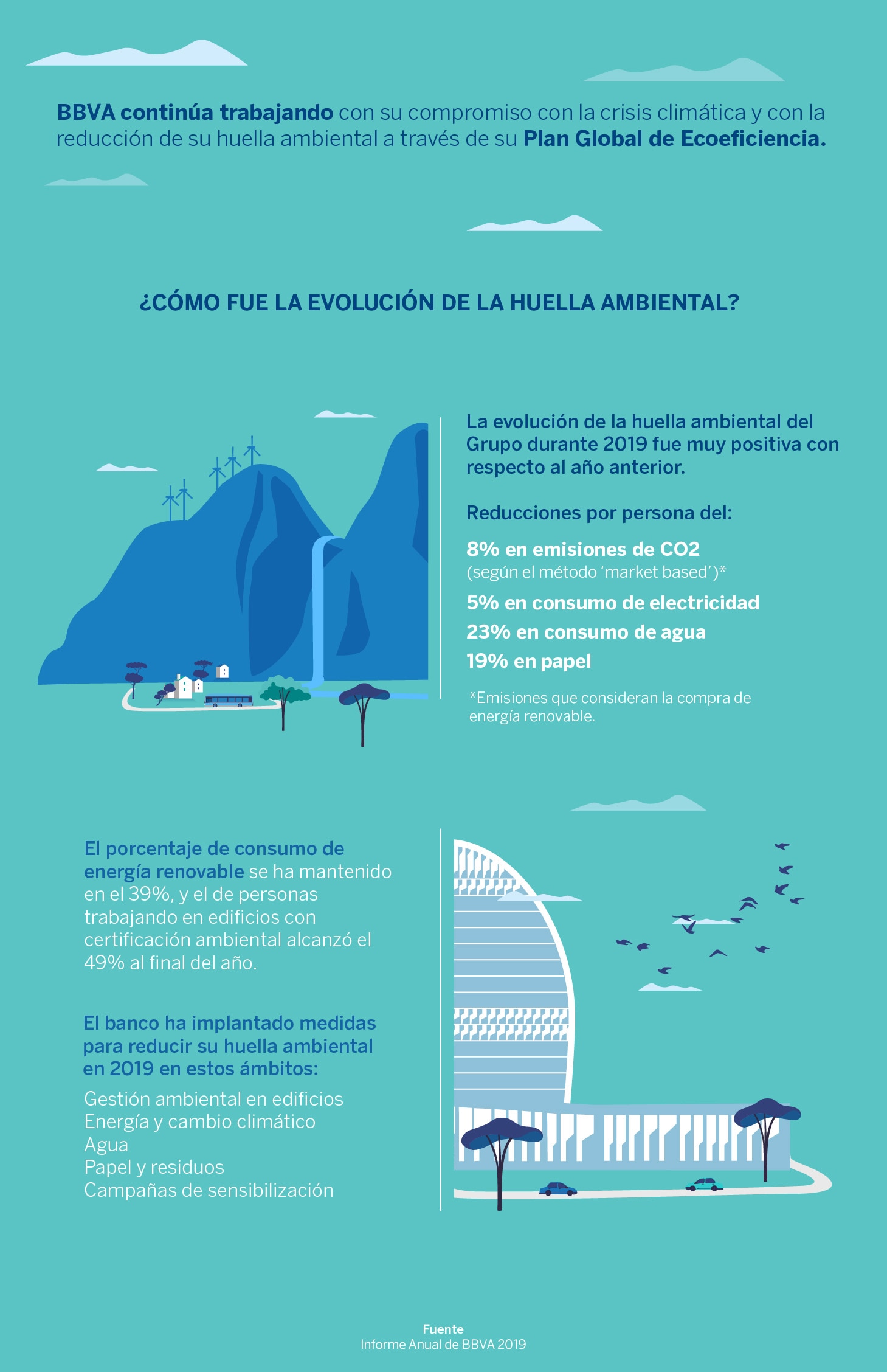 Al margen de la situación provocada por la pandemia, BBVA continúa trabajando en su compromiso con enfrentar la crisis climática y contribuir a la reducción de su huella ambiental. En primer lugar, reduciendo sus impactos a través del Plan Global de Ecoeficiencia. En este sentido, el banco ha implementado medidas en diferentes ámbitos como la gestión ambiental en edificios, energía y cambio climático, agua, papel y residuos y campañas de sensibilización. Y en segundo lugar, con la compensación de las emisiones que no se han podido reducir con las medidas descritas anteriormente. Así, en 2020 BBVA se ha comprometido en ser neutro en carbono.