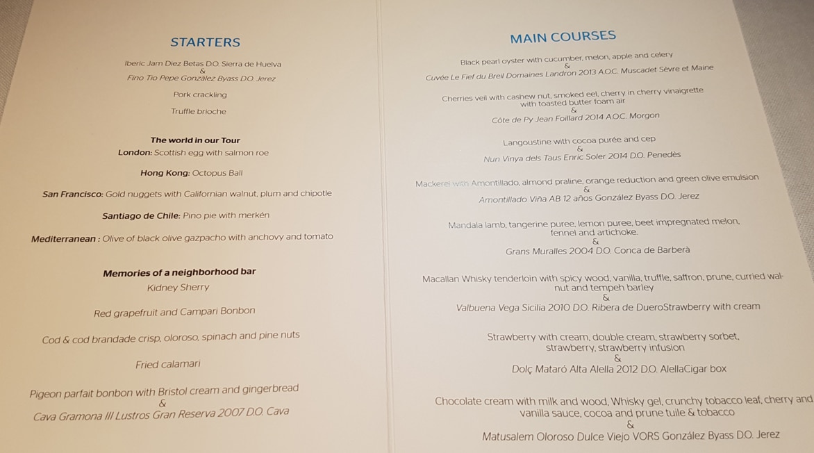 Josep Roca construyó un maridaje que recibió elogios de los clientes e invitados de BBVA, que degustaron marcas históricas como Tío Pepe, Gramona, Vega Sicilia o Torres. El sumiller de El Celler de Can Roca quiso así homenajear a algunas de sus denominaciones de origen favoritas, y reivindicar en territorio anglosajón la calidad del vino español. Durante su discurso de agradecimiento tras la última de las cenas de la Gira BBVA 2016, Josep Roca reconoció que cocinar en la capital británica "es un privilegio que compartimos con nuestro equipo, sin el cual no podríamos viajar por el mundo. Londres es la ciudad financiera más importante de Europa, y para todos nosotros es una ocasión histórica haber trabajado aquí".