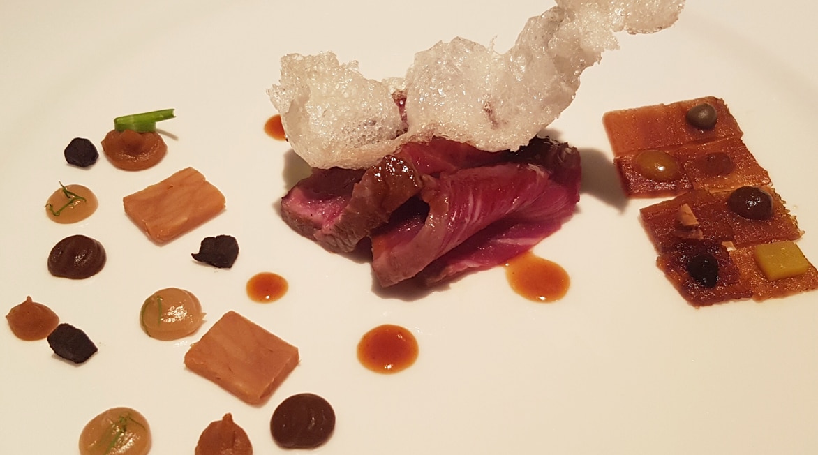5Velo de cerezas con anacardo, anguila ahumada, cerezas en vinagreta de cerezas con aire de mantequilla tostada