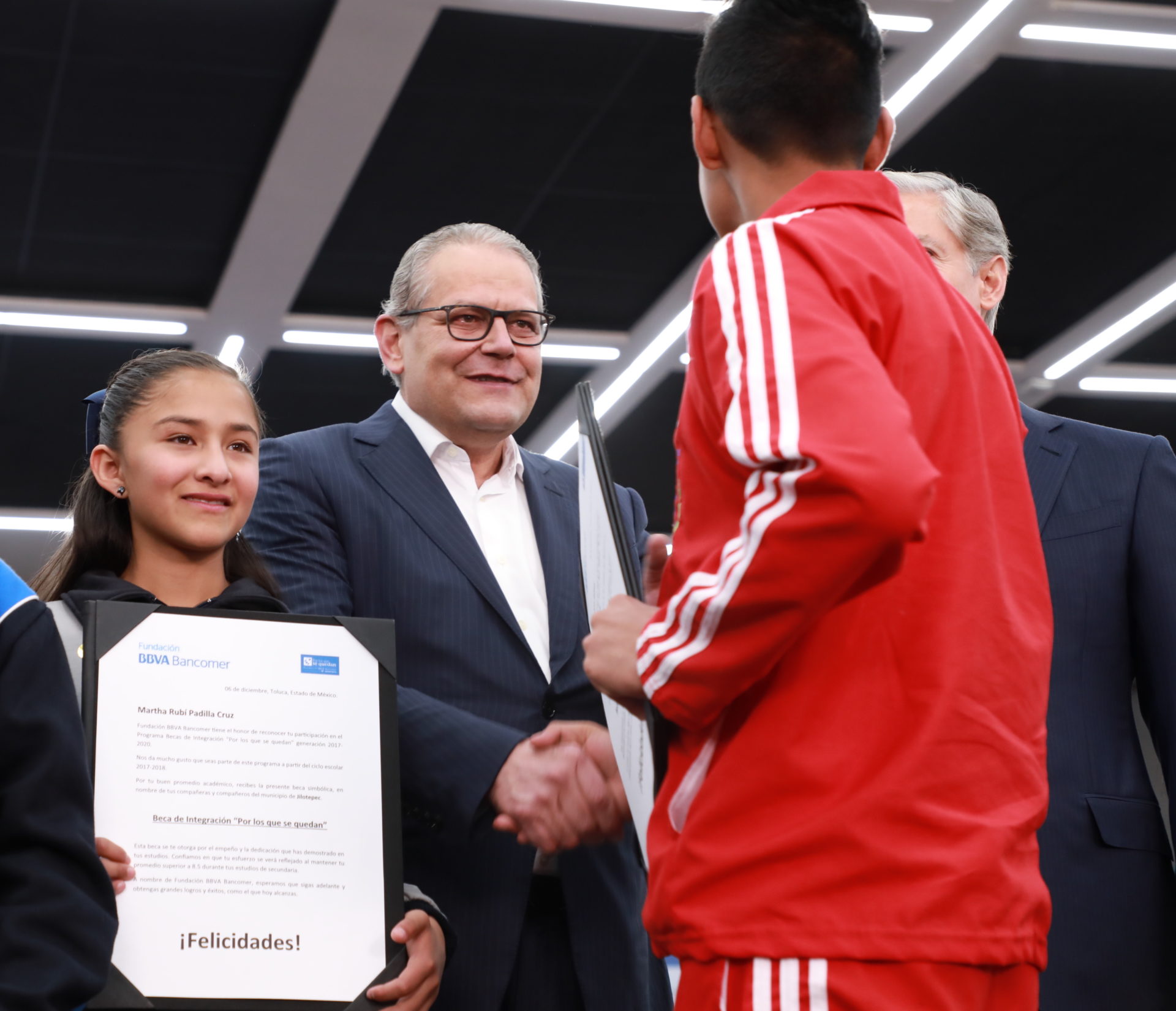 En una ceremonia a la que asistieron el gobernador del Estado de México, Alfredo del Mazo Maza; el Presidente del Consejo de Administración de BBVA Bancomer, Luis Robles Miaja; Juan Jaffet Millán Márquez, Secretario de Educación Estatal y Adolfo Albo Márquez, Jefe de Gabinete de Presidencia de BBVA Bancomer, se hizo la entrega simbólica de becas a estudiantes que representan a los 689 beneficiarios, que se suman a los 1,320 que están vigentes y cursando segundo y tercer año de secundaria y preparatoria para llegar a un total de 2,009 becarios activos.