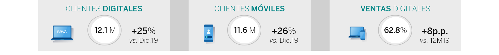 Destaca el crecimiento de transacciones financieras por canales digitales (web y móvil) del 55% con respecto al 2019 y durante el año se realizaron más de 782 millones de transacciones. Cabe destacar que cerca del 44% del total de las operaciones financieras reportadas en 2020 fueron por medios digitales comparado con 32% en 2019, mientras que en ventanilla representaron el 8% del total comparado con 12% en 2019. Al cierre del 2020, se registraron 12.1 millones de clientes digitales, 25% más que en el mismo periodo de 2019. Destaca que el 62.8% de las ventas totales se realizaron a través algún canal digital, con respecto al 55% observado durante el 2019.