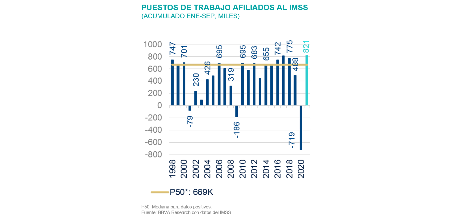 Se confirma mejor dinamismo del empleo para el segundo semestre de 2021. La creación de empleo formal del Instituto Mexicano del Seguro Social (IMSS) ha sido incluso mayor a la esperada: el dato de septiembre de 2021 arroja una creación de empleo sin precedentes. Uno de los factores que explican este dinamismo es el ajuste generado en el mercado laboral por la reforma para eliminar el outsourcing.