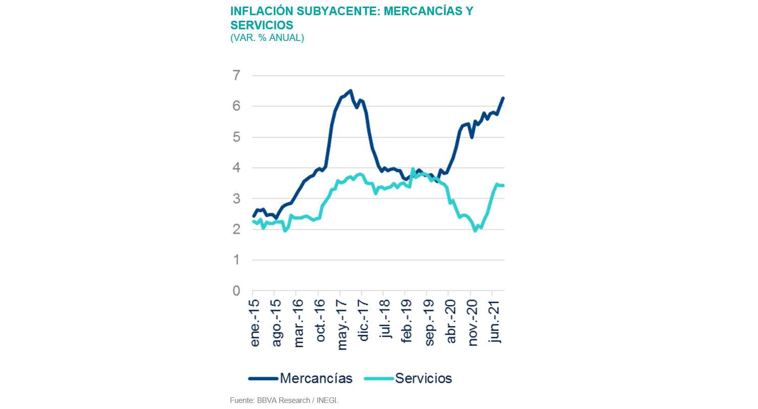Con ello, la inflación interanual de las mercancías se aceleró a 6.3% en septiembre, frente al 5.8% observado tanto al cierre del primer trimestre como del segundo, derivado de una aceleración de los precios de las mercancías a 6.9% AaA al cierre de 3T21, 0.5 puntos porcentuales (pp) más alta que en junio, y de la permanencia en niveles elevados de la inflación de las mercancías no alimenticias: 5.6% AaA en septiembre, nivel similar al 5.7% observado en junio.