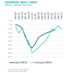 Los primeros datos de marzo muestran un repunte del consumo privado registrándose una recomposición de la demanda hacia los servicios. De acuerdo con el Indicador de Consumo BBVA, el gasto en terminales punto de venta efectuado en hoteles y restaurantes alcanzó una variación real interanual de 29.3% y 32.0% en la última semana de marzo, respectivamente, mientras que las cifras de ventas de vehículos ligeros del INEGI señalan mayor dinamismo en el mismo mes, con el número de unidades vendidas alcanzando 91.1% de su nivel previo a la pandemia. Así, la señal de un retorno más rápido a la normalidad imprime un sesgo al alza en el consumo y en la estimación de crecimiento de BBVA México para 2021.