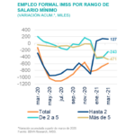 Por nivel de ingreso, la brecha de empleos ha tenido una recomposición importante, inicialmente la pérdida fue de puestos de trabajo con ingreso de hasta dos salarios mínimos; sin embargo, este empleo prácticamente se recuperó y muestra saldo positivo desde enero de este año. En contraparte, hubo una sustitución de estos empleos, que implicó una pérdida de puestos de trabajo de mayor remuneración, que de manera acumulada a marzo suman 243 mil empleos menos de 2 a 5 salarios mínimos y de 471 mil empleos menos de más de cinco salarios mínimos, es decir, pérdida de empleos en niveles salariales, que dado el contexto económico son más difíciles de recuperar.
