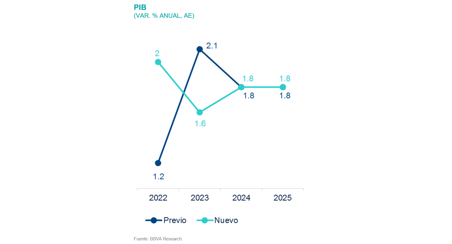 Considerando los factores anteriores, el informe “Situación México”, elaborado por el área de Estudios Económicos de BBVA México revisa al alza su estimación de crecimiento para 2022 a 2.0% (1.2% previo) ante el buen desempeño de la primera mitad de este año. Por otro lado, revisa a la baja su estimación de crecimiento para 2023 a 1.6% (2.1% previo) ante el futuro deterioro del consumo privado y la inversión en un entorno de alta inflación y condiciones monetarias más restrictivas.