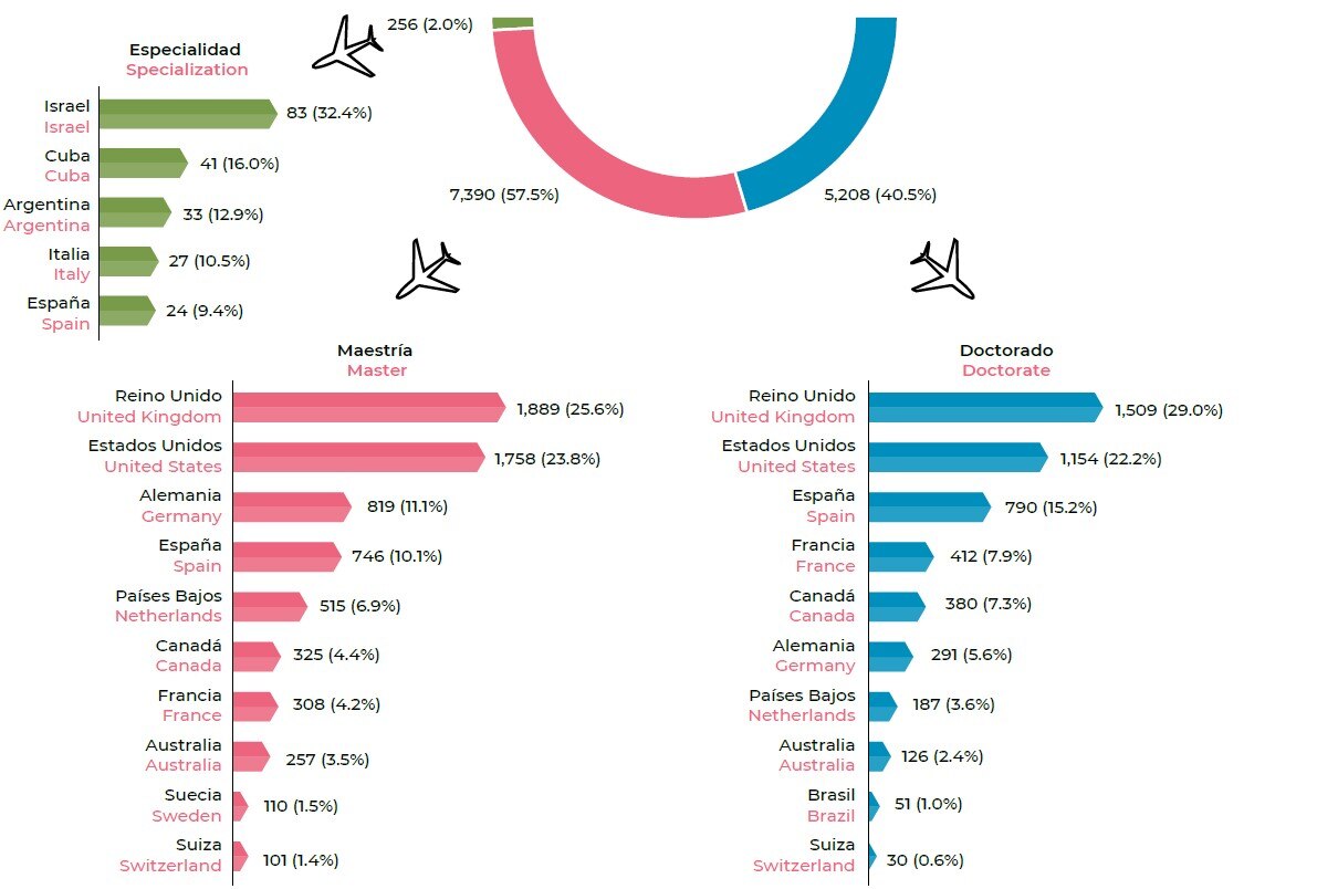 El Anuario incluye por primera vez un capítulo sobre los mexicanos estudiantes en el extranjero. En los últimos años, hay cerca de 30,000 mexicanos en el extranjero inscritos en programas completos de nivel licenciatura o posgrado. Entre 2015 y 2018, Conacyt apoyó a casi 13,000 mexicanos para estudiar en el extranjero una maestría o doctorado. Para maestría, los cinco destinos preferidos fueron: Reino Unido, Estados Unidos, Alemania, España y Países Bajos; para doctorado, los cinco principales destinos fueron: Reino Unido, Estados Unidos, España, Francia y Canadá.