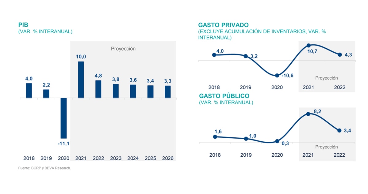 En su informe Situación Perú, BBVA Research estima que la economía peruana crecerá un 10% durante el 2021, considerando que las condiciones externas seguirán siendo favorables para el país. Además, esta previsión está fuertemente relacionada al resultado electoral y a las medidas que anuncie e implemente la nueva administración que asumirá a finales de julio.