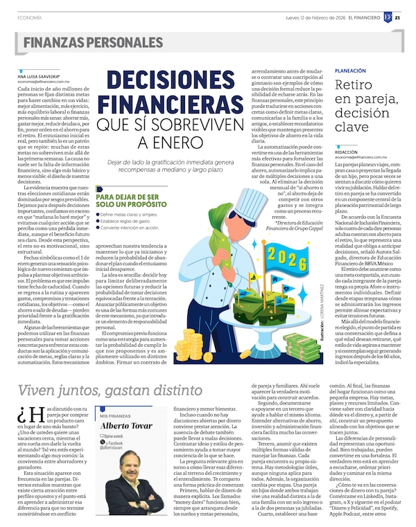 “Las parejas planean viajes, compran casa o proyectan la llegada de un hijo, pero pocas veces se sientan a discutir cómo quieren vivir su jubilación. Hablar del retiro en pareja se ha convertido en un componente central de la planeación patrimonial de largo plazo”, así lo destacó Aurora Geitel Salgado, directora de Educación Financiera de BBVA México, en su artículo "Retiro en pareja, decisión", publicado en el periódico El Financiero.